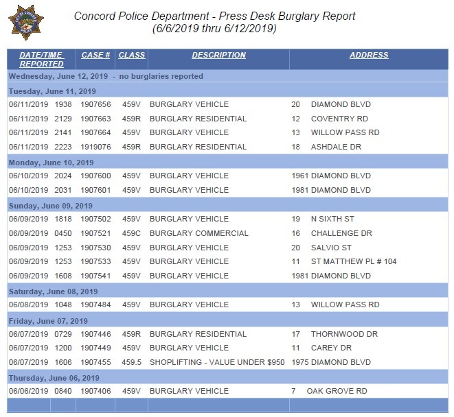 This is the Concord Police weekly burglary report. Please click on the image for a much larger view.
