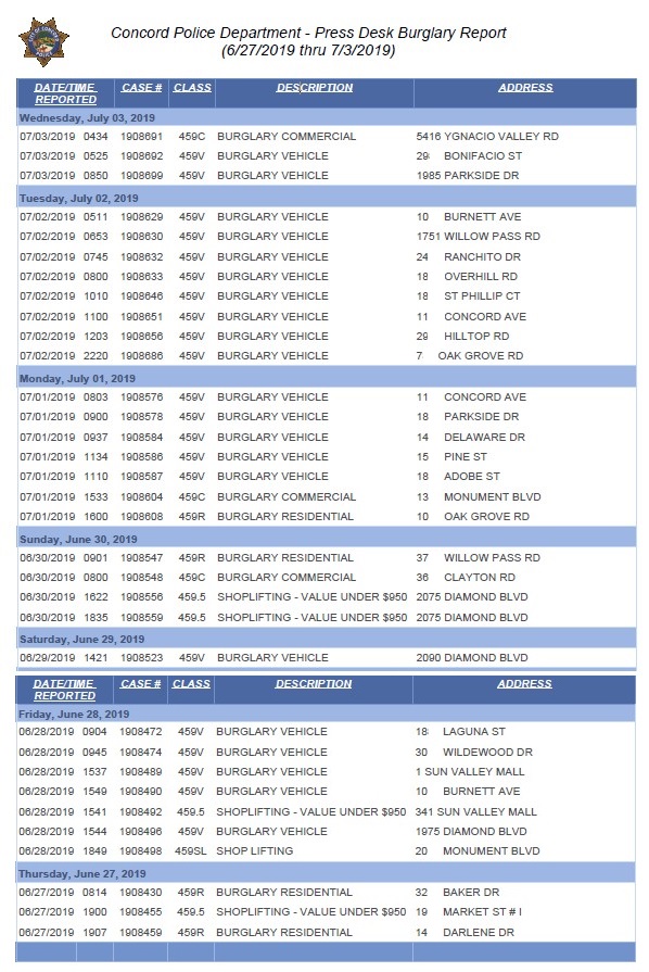 This is the Concord Police weekly burglary report. Please click on the image for a much larger view.