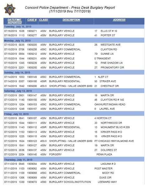 This is the Concord Police weekly burglary report. Please click on the image for a much larger view.