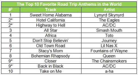 Rock tunes dominate the top 5 most popular road trip songs, with “Hotel California,” “Highway to Hell,” “All Star,” and “Africa” also featuring alongside the Journey classic “Don’t Stop Believin.”