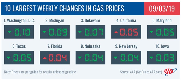 This week, gas prices are as much as nine cents cheaper in every state except California, (+5 cents), Florida (+4 cents), Ohio (+2 cents) and South Carolina (+1 cent).