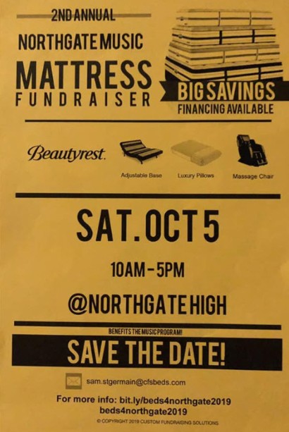 Uncategorized Big Savings! Northgate High School Music Department Holding Mattress Fundraiser On Oct.5 by CLAYCORD.com September 19, 2019 - 7:00 PM September 19, 2019 - 7:00 PM 0 comment Saturday Oct.5 will be the 2nd Annual Mattress Fundraiser for the Northgate High School Music Department. Please click on the flyer shown above to learn more. Share 0 FacebookTwitterPinterestEmail previous post Detectives Seek Additional Information In Alleged Sexual Abuse Of A Minor Case next post Pleasant Hill City Council: County’s Plan To Close Library Not Acceptable To Public