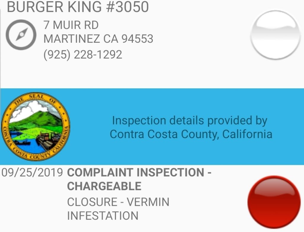 Burger King, located at 7 Muir Rd. in Martinez, was closed on Sept.25 after inspectors from the Contra Costa County Health Department say they found the following.