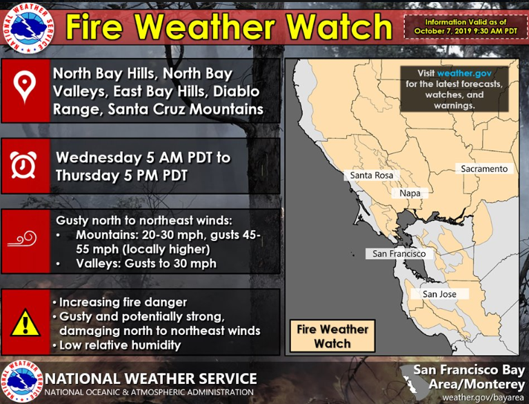 The National Weather Service has called a Fire Weather Watch to go from Tuesday night through Thursday, including parts of the North and East Bay as well as the Santa Cruz Mountains. Forecasters say it’s likely to be