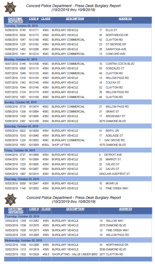 This is the Concord Police weekly burglary report. Please click on the image for a much larger view.