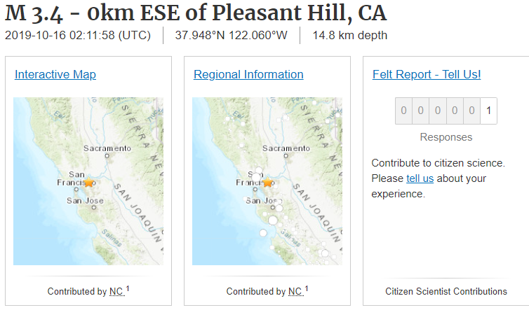 Felt in Benicia – it was the first earthquake I’ve felt that didn’t roll or jerk side to side. Instead the dang bed jumped up and down and slammed on the floor. Friends in Vacaville also felt it
