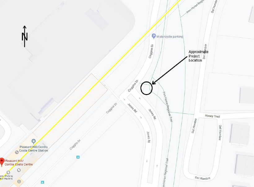 Contra Costa County Public Works will repair a section of walkway on the Iron Horse Trail, located at the eastern corner of the intersection of Coggins Drive and Jones Road in Walnut Creek starting Monday, October 28 and ending on Thursday, November 5.