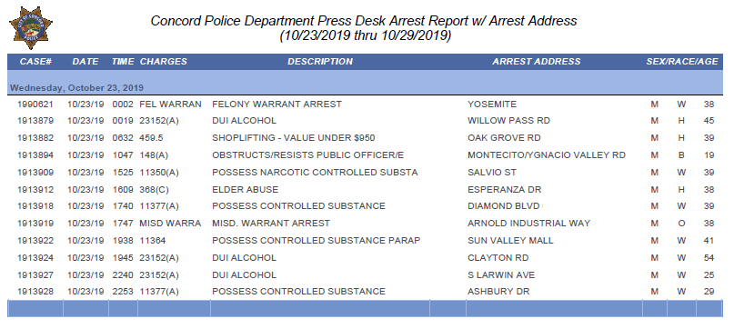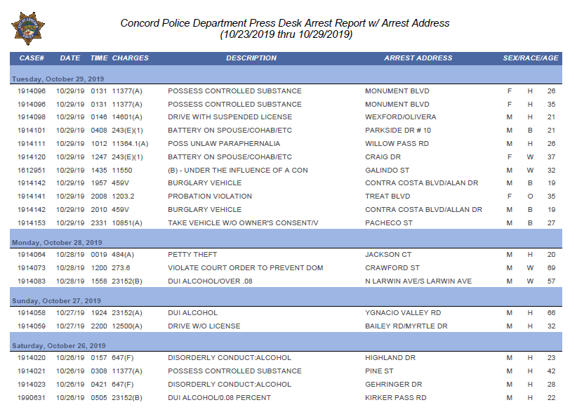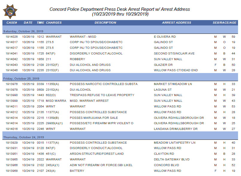 Uncategorized The Concord Police Weekly Arrest Report by CLAYCORD.com November 3, 2019 - 1:00 PM November 3, 2019 - 1:00 PM 2 comments CPD 1CPD 2CPD 3 Share 0 FacebookTwitterPinterestEmail previous post Concord Police Weekly Burglary Report – 21 Burglaries Between Oct.23 – Oct.29 next post Pushing Back The Bell – Cal-Hi Sports Editor Mark Tennis Looks At How The State’s New School Start Time Bill Might Affect High School Athletics 2 Comments Inline Feedbacks View all comments Noj November 3, 2019 - 4:33 PM 4:33 PM Thank you Concord PD and thank you Mayor (Claycord). Would like to start seeing mugshots of these people. Have seen it done elsewhere in California. Even the Concord PD website has no mugshots. From Concord PD website: Search: mugshot Search Result: No results found. We can help. We want to help. deirdre November 8, 2019 - 10:07 PM 10:07 PM Weird that 2 of these cases start with 199**** and all the rest start with 191****.