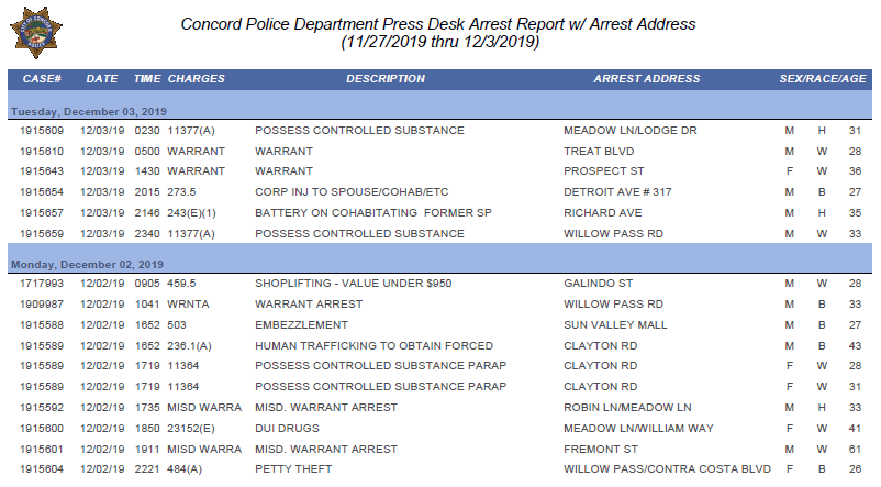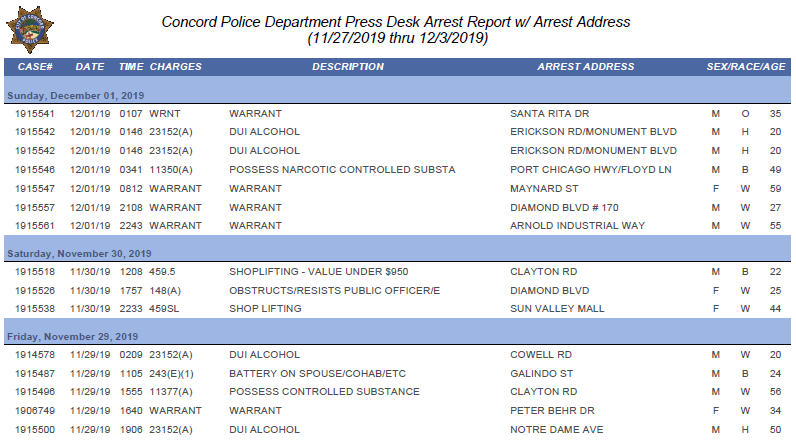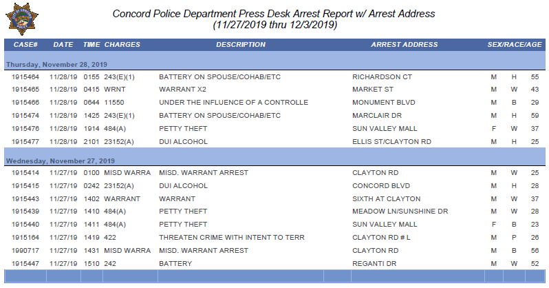Uncategorized The Concord Police Weekly Arrest Report by CLAYCORD.com December 7, 2019 - 4:00 PM December 7, 2019 - 4:00 PM 1 comment CPD - 1CPD - 2CPD - 3 Click on each image above to view the Concord Police weekly arrest report. Share 0 FacebookTwitterPinterestEmail previous post Concord Police Weekly Burglary Report – 31 Burglaries Reported Between Nov.27 – Dec.3 next post The Clayton Police Weekly Activity Report 1 Comment Inline Feedbacks View all comments John P December 7, 2019 - 5:48 PM 5:48 PM Sure would like to see a cross street referenced in every arrest.
