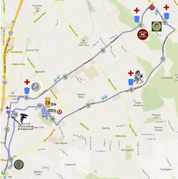 Nearly 1,500 runners will compete along the 13.1 mile loop around N. Civic Drive, Oak Rd., Treat Blvd. (into Concord), Cowell Road (in Concord), and Ygnacio Valley Road. The curbside lanes on these streets will be coned off and designated for runners.