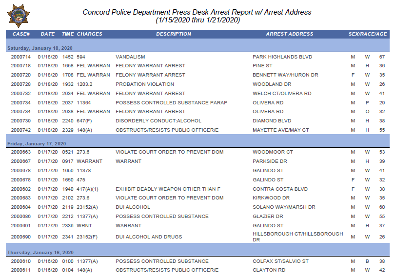 Uncategorized The Concord Police Weekly Activity Report by CLAYCORD.com January 25, 2020 - 7:00 PM January 25, 2020 - 7:00 PM 0 comment CPD - 1CPD - 2CPD - 3 Click on each image above to view the Concord Police weekly activity report. Share 0 FacebookTwitterPinterestEmail previous post The Concord Police Weekly Burglary Report – 27 Burglaries Reported Between Jan.15 – Jan.21 next post One Arrested, 25 Cited During DUI Saturation Patrol In Concord