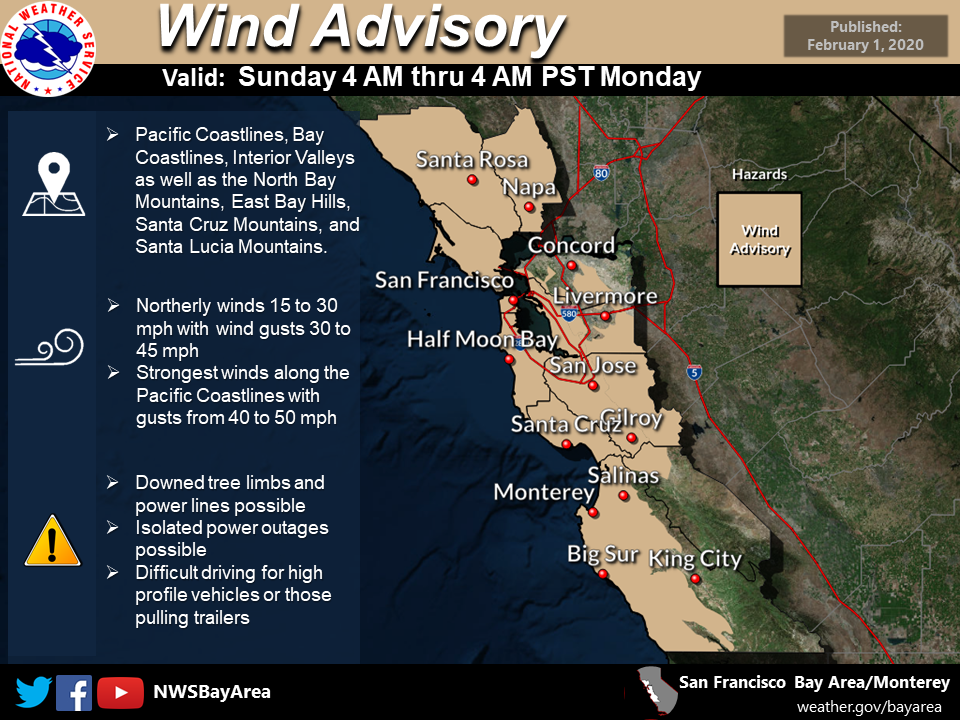Uncategorized National Weather Service Issues Wind Advisory For The Bay Area by CLAYCORD.com February 1, 2020 - 7:00 PM February 1, 2020 - 7:00 PM 3 comments A wind advisory has been issued for the San Francisco Bay Area, according to the National Weather Service. The advisory is valid from 4 a.m. on Sunday until 4 a.m. on Monday. Wind gusts are expected to reach 45-mph, the Weather Service said. Advertisement Share 0 FacebookTwitterPinterestEmail previous post Travis AFB One Of Four U.S. Bases To House Coronavirus Evacuees next post Two Arrested During DUI Saturation Patrol In Concord On Friday 3 Comments Inline Feedbacks View all comments WC February 2, 2020 - 11:19 AM 11:19 AM Be amazed if PG&E doesn’t shut the power off in the middle of the Superbowl. Cyco Miko February 2, 2020 - 12:27 PM 12:27 PM Already trees down on Treat near Bancroft. Bad Nombre February 3, 2020 - 11:28 AM 11:28 AM Was that a groundhog I saw rolling and blowing away yesterday?