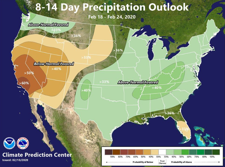 The 8 to 14 day outlook (February 18 to 24) from the National Weather Service Climate Prediction Center continues to favor below-normal precipitation across California.