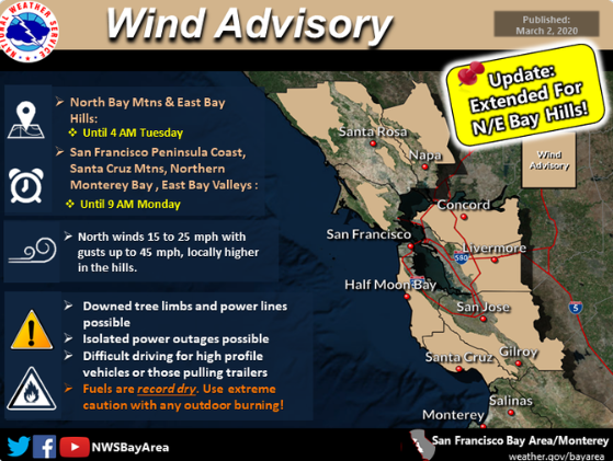 A wind advisory will remain in effect for the North Bay and East Bay hills through early Tuesday morning, according to the National Weather Service.