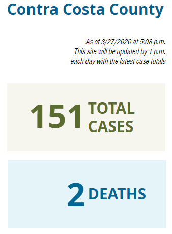 Contra Costa is now reporting 151 confirmed cases of coronavirus in the county, which is four more than this morning and 20 more than yesterday.