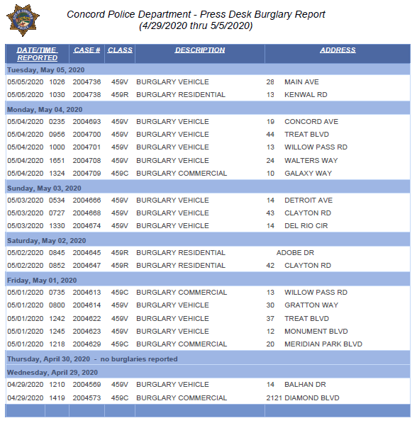 This is the Concord Police weekly burglary report. Please click on the image for a much larger view.