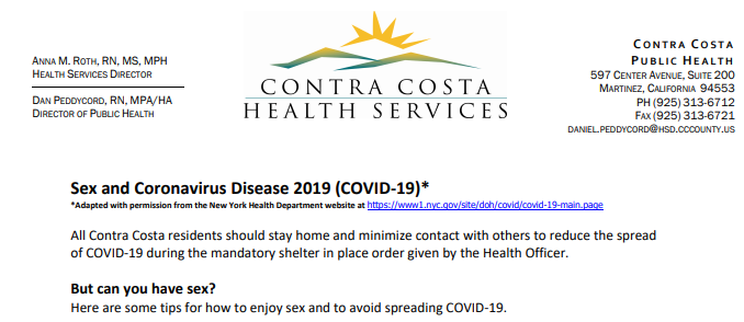 For those thinking it’s a spoof, it is on the Contra Costa County heath department’s web site at https://www.coronavirus.cchealth.org/for-the-community Go there and look on the page for “Sex During the COVID-19 Outbreak“. It’s also available in Spanish.