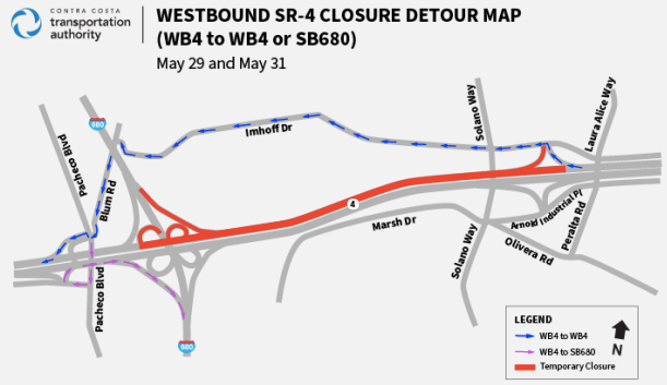 The closures will allow vehicle traffic to move to the newly constructed connector ramps from northbound Highway 680 to eastbound Highway 4 and from westbound Highway 4 to northbound Highway 680.