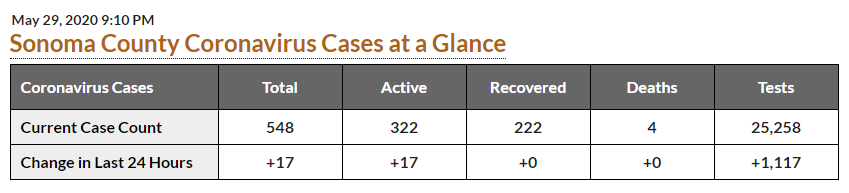 As of Friday, Sonoma county had 548 confirmed cases of COVID-19, with four deaths. The county’s population is 494,336.