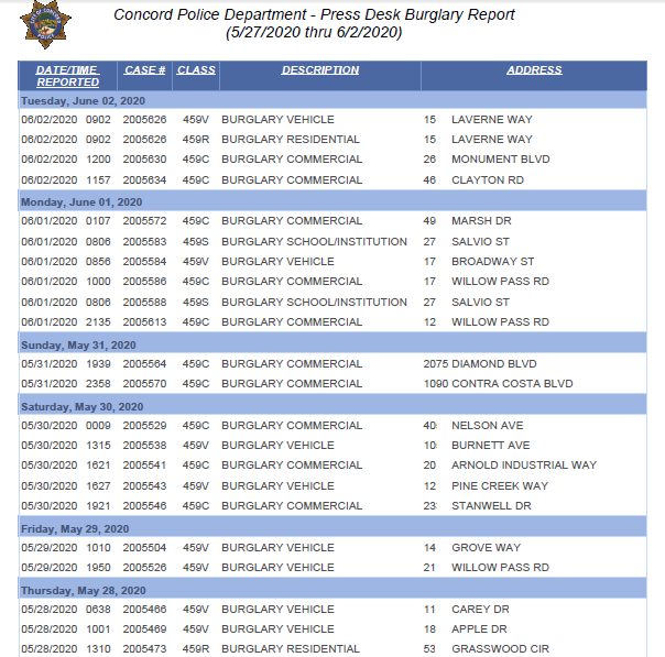 According to the Concord Police, the report shown above only includes approved reports. Some burglary reports might not be written or completely approved, which is why they are not included in this post.