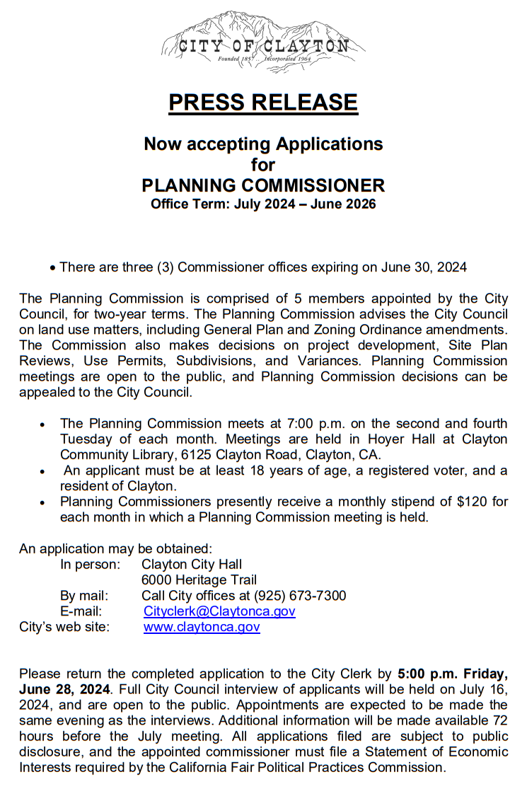 Local News City Of Clayton Now Accepting Applications For Three Planning Commissioners by CLAYCORD.com June 19, 2024 - 8:00 AM June 19, 2024 - 8:00 AM 0 comment Share 0 FacebookTwitterPinterestEmail previous post Claycord Online Museum – The Old Brown BART Seats & Carpet next post BART: BART’s New Budget Avoids Service Cuts And Continues Investment In Rider Safety