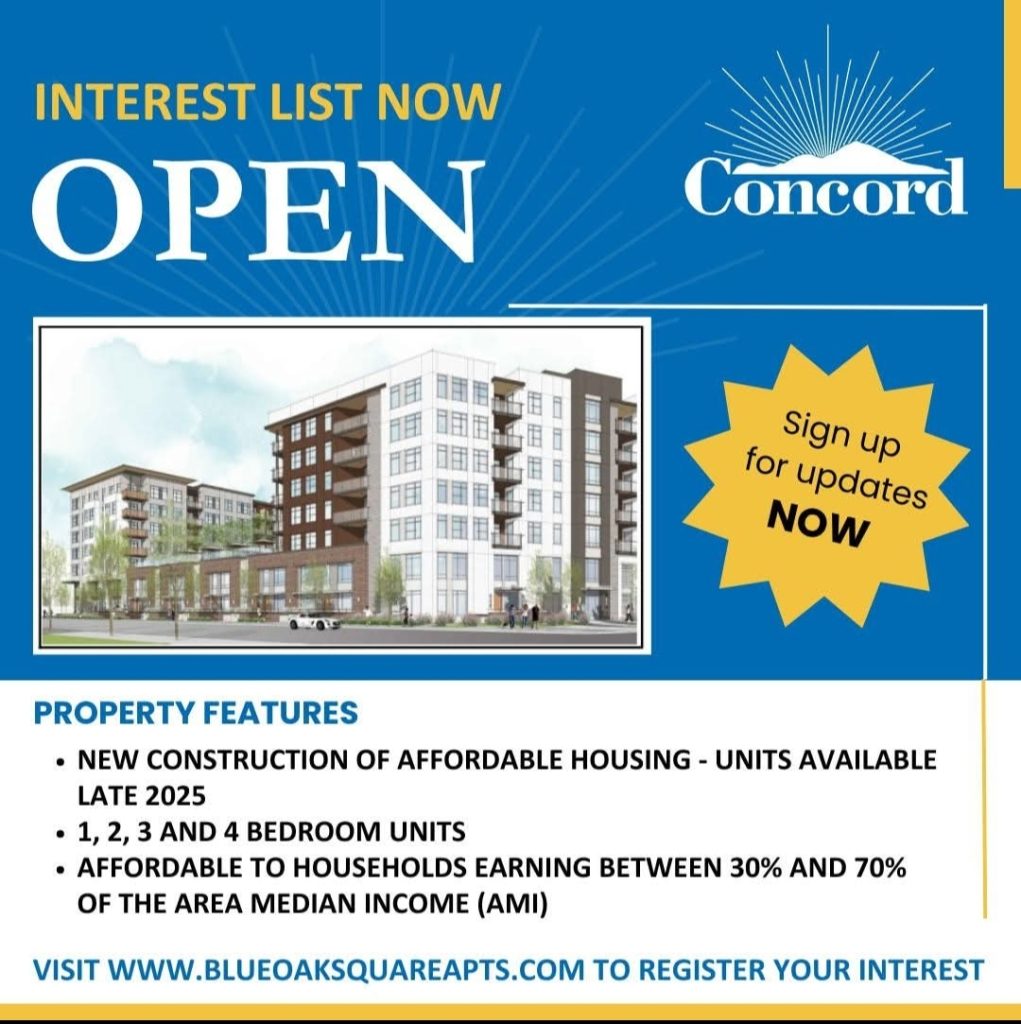 The City of Concord has announced that Blue Oak Square has released their Interest List for their 181 units of brand new affordable rental homes located at 2400 Willow Pass Road. Construction is scheduled to be completed at the end of 2025.