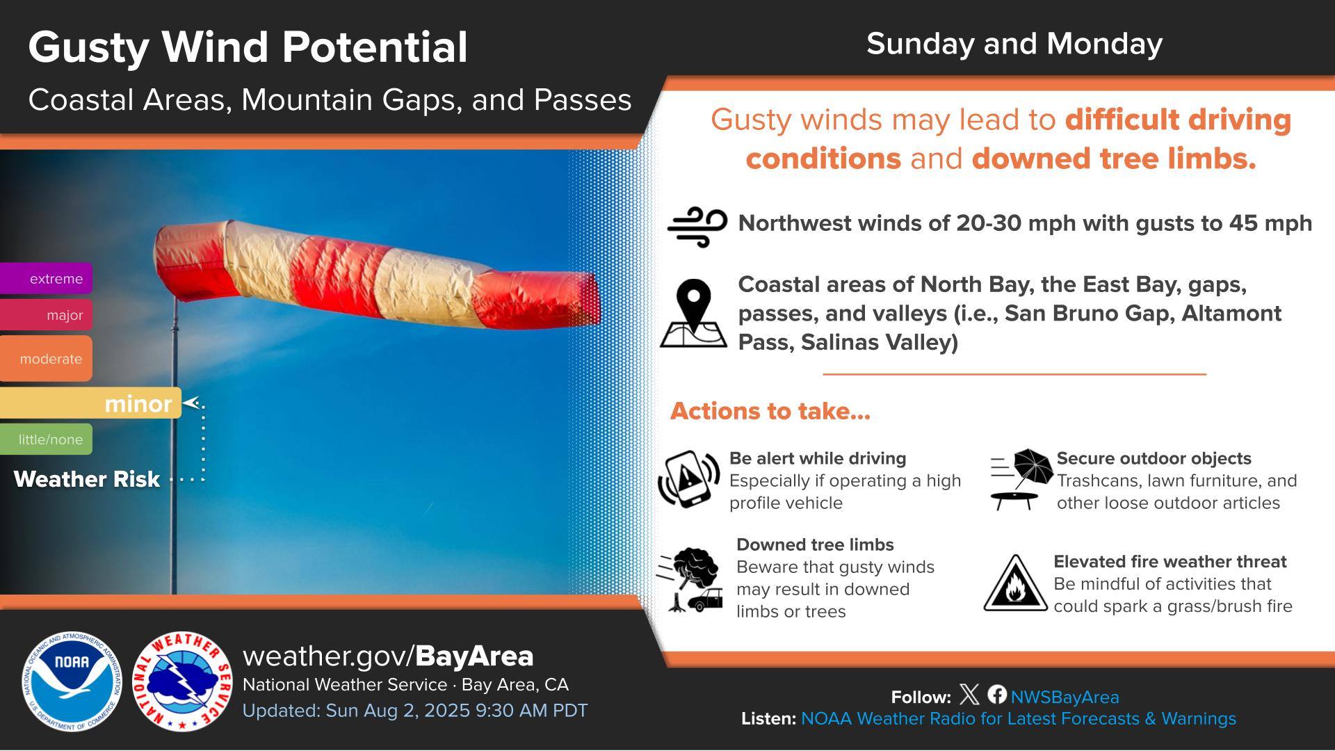 Northwest winds of 20 to 30 mph, with gusts up to 45 mph, are expected to persist through Monday, particularly in coastal areas of the North Bay, parts of the East Bay, and through gaps, passes, and valleys, including the San Bruno Gap, Altamont Pass, and Salinas Valley. Residents are urged to secure loose outdoor items and use caution while driving, especially in high-profile vehicles. Be on the lookout for downed trees or branches, and remember that these strong winds could quickly intensify any grass or brush fires.