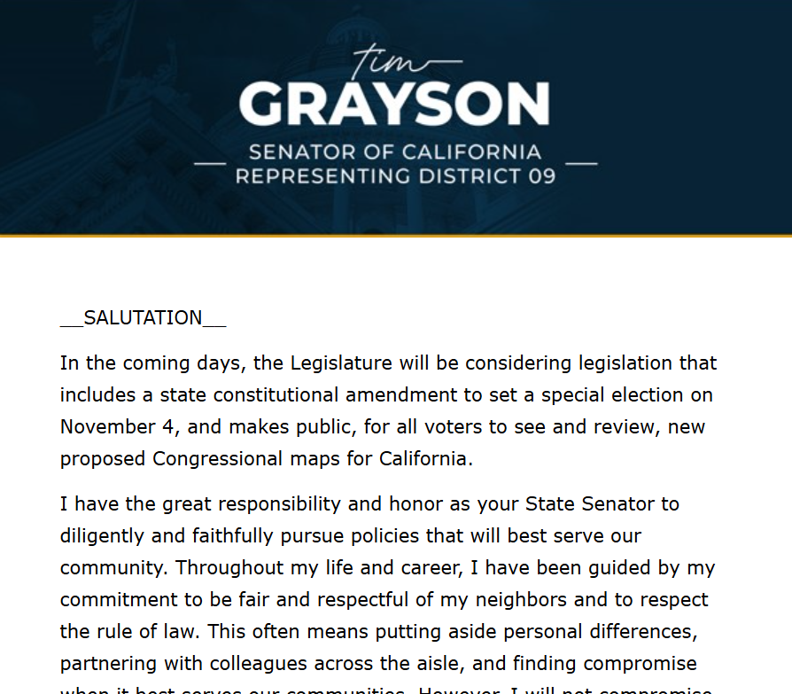 Your “commitment to be fair and respectful” is sadly lacking. If you really held those traits you would have been complaining and writing these emotional letters about the gerrymandering that was already in place when you took office, the gerrymandering that specifically silences conservatives in CA. I hope you’re proud of the dumpster fire you and your ilk have turned our once beautiful state into.