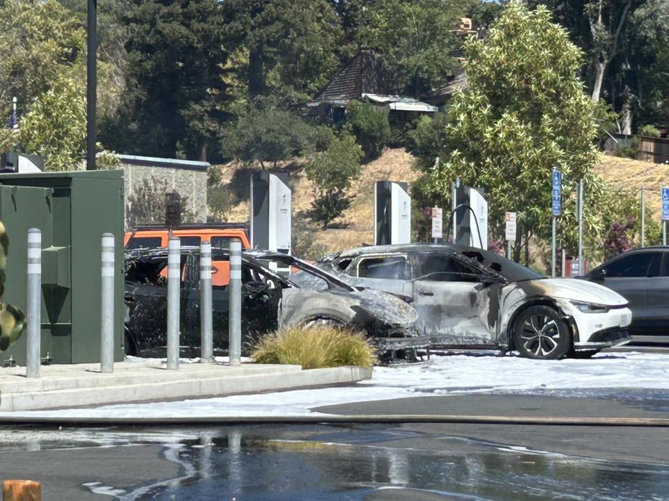 Contra Costa County Fire Protection District crews responded Tuesday to reports of two vehicles burning at an electric vehicle charging station in the Rossmoor Shopping Center parking lot near Tice Valley Boulevard and Rossmoor Parkway in Walnut Creek. Witnesses initially reported one vehicle on fire, but flames spread to a second vehicle parked at the adjacent charger. Thick smoke was visible from the area as firefighters worked to bring the situation under control. As of the latest update, batteries have been disconnected and power to the charging stations has been shut off. No injuries have been reported, and investigators will determine the cause of the fire.