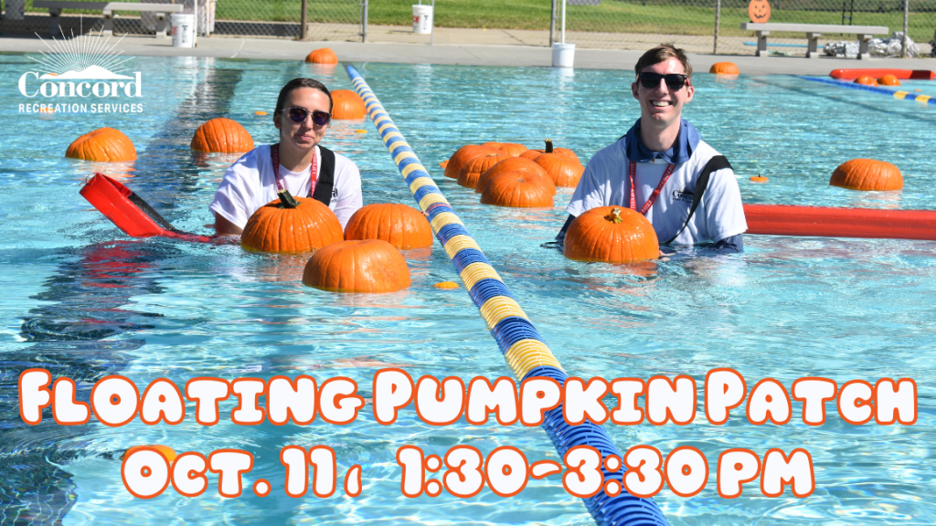 Join the Aquatics team for their annual Floating Pumpkin Patch on Saturday, October 11, from 1:30 p.m. to 3:30 p.m. at the Concord Community Pool! Splash around and pick out the best pumpkin in our shallow water lanes. Once you have picked the best pumpkin in the patch, get dressed in your Halloween costume, head over to the grass area, and decorate while enjoying spooktacular music, arts and crafts, and games! Anyone who plans on participating in this event must register in advance. To register, click here.