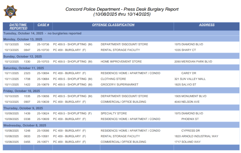 Local News The Concord Police Weekly Burglary Report by CLAYCORD.com October 20, 2025 - 10:00 AM October 20, 2025 - 10:00 AM 1 comment Share 0 FacebookTwitterPinterestEmail previous post Newsom Signs Some Reparations Bills, Vetoes Others – Debate Over Next Steps Begins next post The Water Cooler – Get Rid Of One Forever: Coffee, Air Conditioning Or Wi-Fi? 1 Comment Inline Feedbacks View all comments domo October 20, 2025 - 12:11 PM 12:11 PM Can we get these on a regular basis? Also the vehicle related burglaries and vehicle thefts? 6